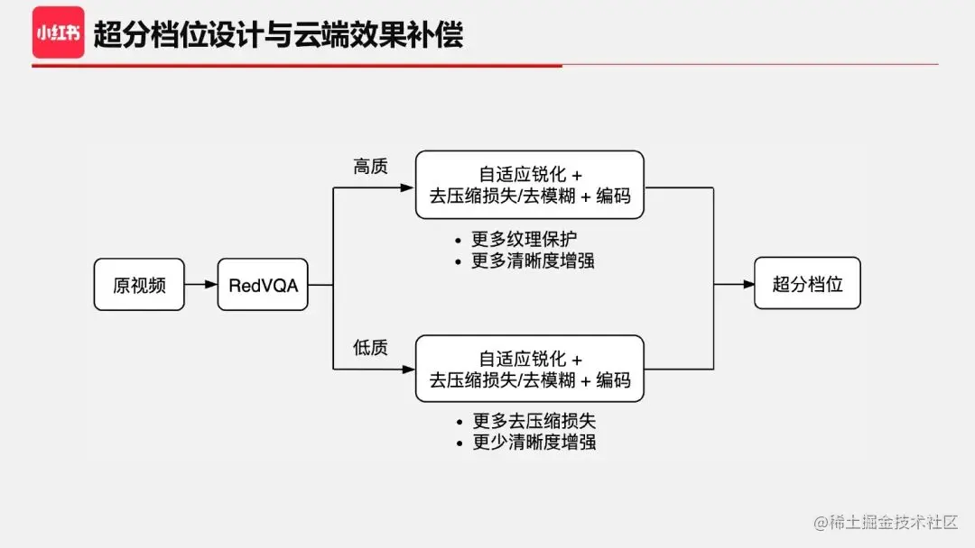 尽管在端侧超分算法上做了精心设计,但受限于其本身的计算量,能实现的效果还是有限。如果是一款终端产品研发,似乎也没有更好的办法。而在我们的视频处理架构中,端侧超分的输入视频或者下发的超分档位是由云端转码而来。通过定制化超分档位,可以有效提升和补偿端侧超分效果。实践中,我们基于 RedVQA 把原视频分成高质和低质。对于高质视频,可以通过云端增强算法有效提升超分后的纹理细节;对于低质视频,重点在于去除一些压缩损失,避免 artifact 放大。
