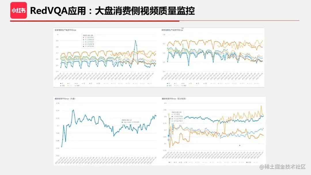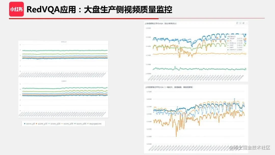 基于 RedVQA,我们实现了一个大盘质量监控看板,按照不同的维度统计视频的质量分。通过这些数据,有助于了解大盘整体的视频质量以及各拆分维度的质量。在有了数据后,后续的优化动作变得有据可依。图中展示了不同垂类的视频质量分,不同分位数的质量统计使得我们对生产侧视频的质量分布有了全局的掌握。右边上图是按照分辨率拆分的生产侧视频质量统计,右边下图是不同编辑方式的统计。