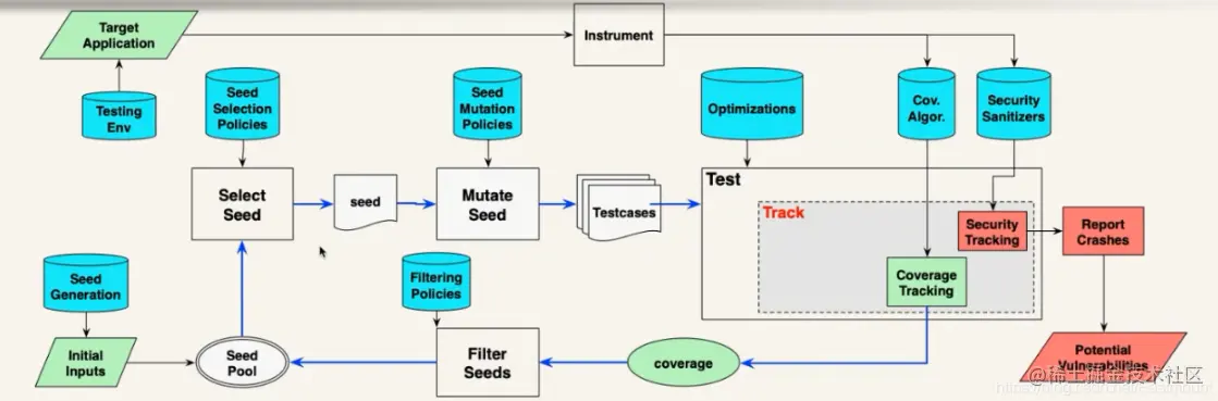 第一块是初始种子,它对Fuzzing的效率还是有很大影响的。如果你不给初始种子,它也会去测试,但是其效率比较低,很多学者去研究如何给一个好的初始种子,让Fuzzing更快地进入状态,更好地找到漏洞。