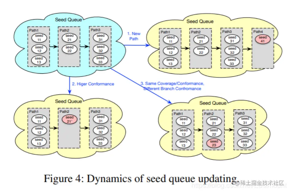 **① 那么,怎么把这个增加进去呢?**我们在原来代码覆盖率基础上增加了一个新的指标,即分支匹配度。原来大家是把这个分支,有好的代码覆盖率,就把它放到种子池中去,种子池是一个线性列表,现在把种子池修改,它还是个列表,但是每个节点不再是一个种子了,它每个节点可能是多个种子。