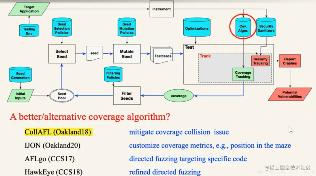 2016年发表在CCS上的AFLfast的策略是如果这个种子在之前测试中很少被选出来,就称为cold,这样的种子后面优先被选出来,或者这个种子搜索的路径在之前的测试中很少被测到,也会优先选择这个种子。还有其他的一些策略,比如VUzzer、AFLgo、QTEP等等,包括张老师他们2018年Oakland提出的CollAFL,这些策略其实没有哪一个是绝对的最好,各有千秋。