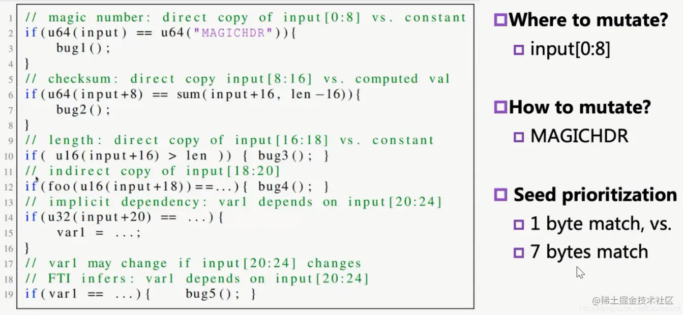 我们人去看这些知识很容易理解,但是Fuzzing过程中,如果想触发bug1,我们在变异时,其实是有一些知识可以获取的。输入前8个字节与“MAGICHDR”进行比较,变异时是要对前8个字节进行变异,而不是随机变异,变异取什么值呢?我们应该取“MAGICHDR”。接着校验和(checksum)也类似,它会把输入中的8个字节(8-16)与算出来的值某个校验和进行对比,我们就要对input[8:16]进行变异,变异所取的值是计算出来的值。