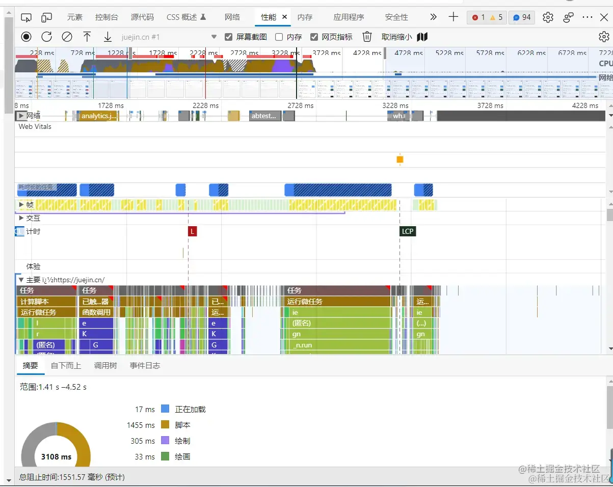 当我们对网站性能要求比较高的时候,可以在performance面板中查看没一帧。每一毫秒中执行了什么,汇总信息查看加载某一个模块花费了多少时间
