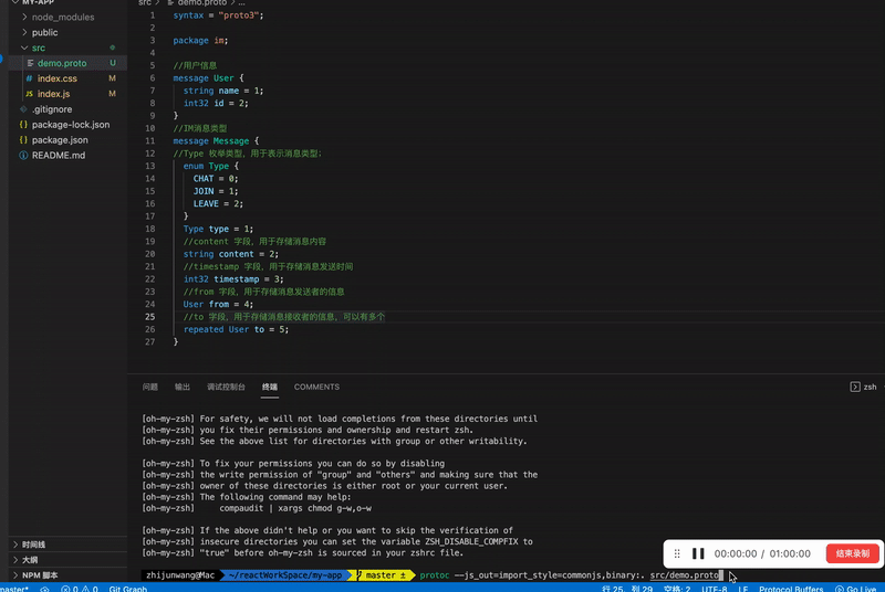 先定义一个.proto文件,然后将 .proto 文件编译生成JavaScript代码文件,编译后生成的代码文件可以引入到前端代码中使用