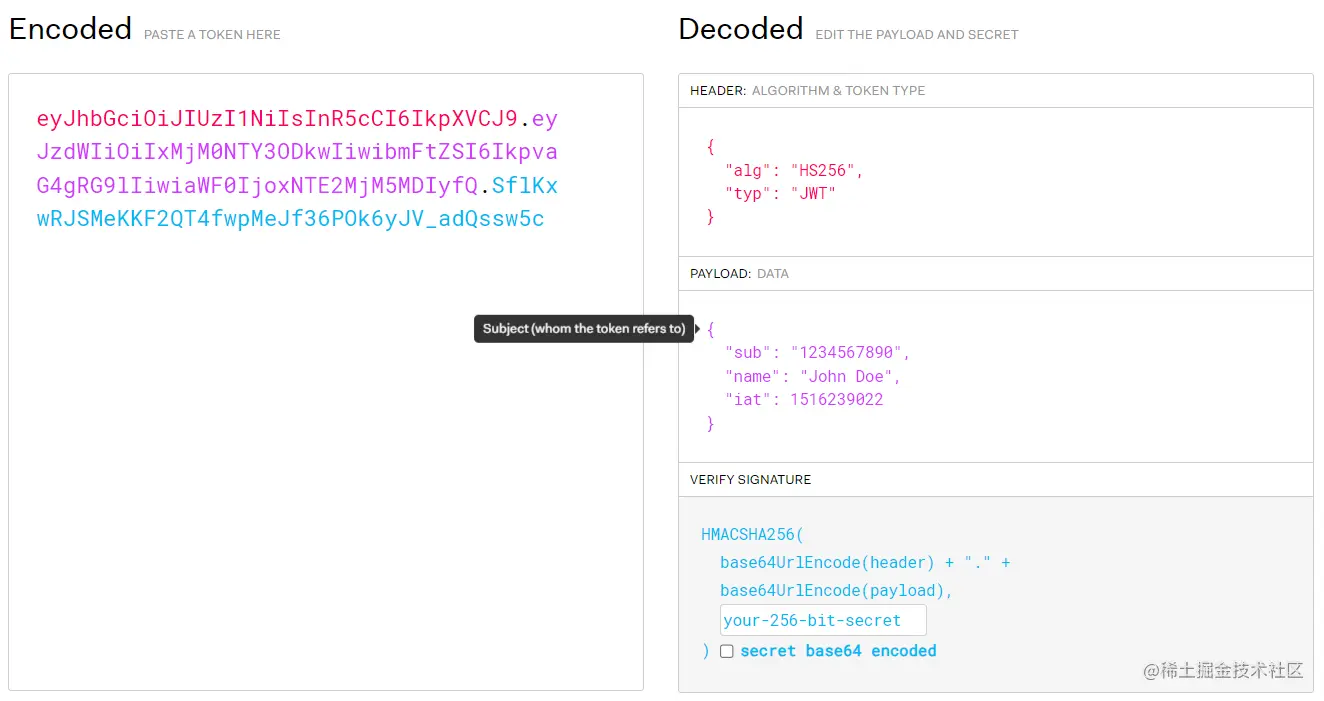 - Signature 使用的是不可逆的加密算法,无法解码出原文,它的作用是校验 Token 有没有被篡改。该算法需要我们自己指定一个密钥,这个密钥存储在服务端,不能泄露