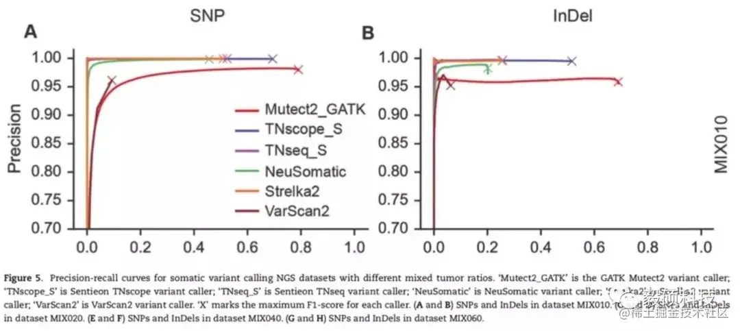 在区分度较大的5%变异丰度数据集中,我们可以看到, TNscope和Mutect2 (和TNhaplotyper2结果一致) 在SNP和Indel检测上都大幅度领先其他软件,尤其是TNscope能够在基本杜绝假阳性的基础上达到较高的灵敏度。
