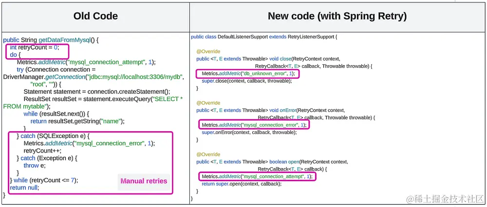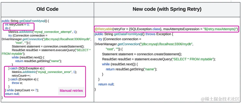 - 以下是一个查询用户全名的代码示例,左边是老代码,右边是使用了 Spring Retry 的新代码。
