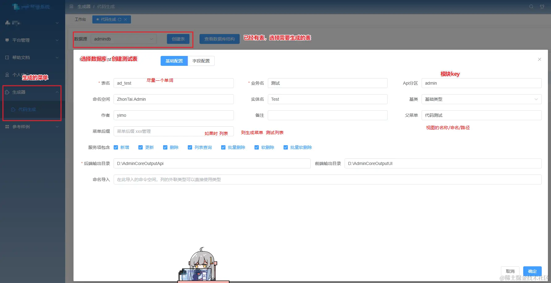 这个测试页因为是生成到平台管理模块所以才需要修改,因为平台模块的key是platform, 打开后左侧导航会无法正确定位,所以需要修改下生成的权限菜单项