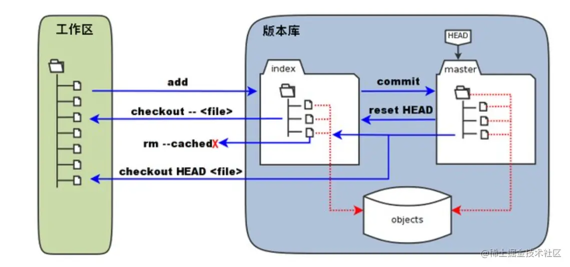 暂存区:英文叫stage或index。一般存放在.git目录下的index文件(.git/index)中,所以我们把暂存区有时也叫作索引(index)。