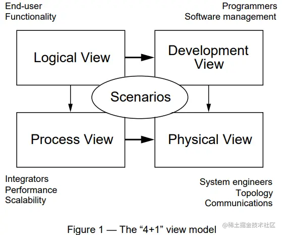 对架构的描述(即架构决策)可以围绕这四个视图进行组织,并通过一些选定的用例或场景进行说明,即第五个视图。稍后我们会看到,架构实际上是从场景部分演化而来的。