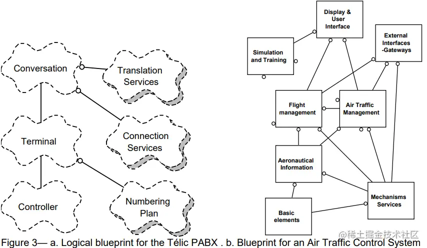 PABX在终端之间建立通信。终端可以是电话机、干线(比如到中心局的线路)、联络线(比如专用的PABX到PABX线路)、功能电话线、数据线、ISDN线等。不同线路需要不同的线路接口卡。线路控制器对象的职责是解码和读取线路接口卡上的所有信号,并将不同线路接口卡的信号转换成一个小的统一的事件集合:开始,停止、数字等。控制器受到硬实时约束。这个类有许多子类来满足不同类型的接口。终端对象的职责是维护终端状态、代表线路进行服务协商。例如在选择阶段使用编号计划业务来解释拨号。会话对象表示参与会话的一组终端。会话对象使用转换服务(目录、逻辑到物理地址映射、路由)和连接服务在终端之间建立语音路径。对于更大的、包含几十个具有架构意义的类的系统,图3b显示了空中交通管制系统的顶层类图,包含8个类分组。