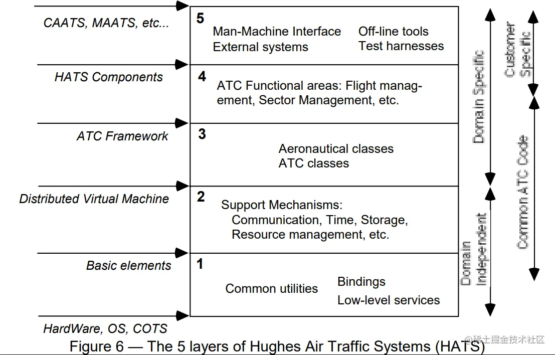 图6表示了加拿大Hughes公司开发的空中交通管制系统产品线的五层开发组织。这是图3b中逻辑架构相对应的开发架构。第1层和第2层构成了一个同业务领域无关的分布式基础设施,它是产品线中的公共部分,为上层子系统屏蔽了硬件平台、操作系统或第三方软件(如数据库管理系统)的变化。在基础设施中,第3层添加了ATC框架,以构造特定领域软件架构。通过这个框架,第4层构建了一个功能选择面板。第5层依赖于客户和产品,包含大多数用户接口和对外部系统的接口。在5个层中分布着大约72个子系统,每个子系统包含10到50个模块,这些可以在额外的图表中展示。