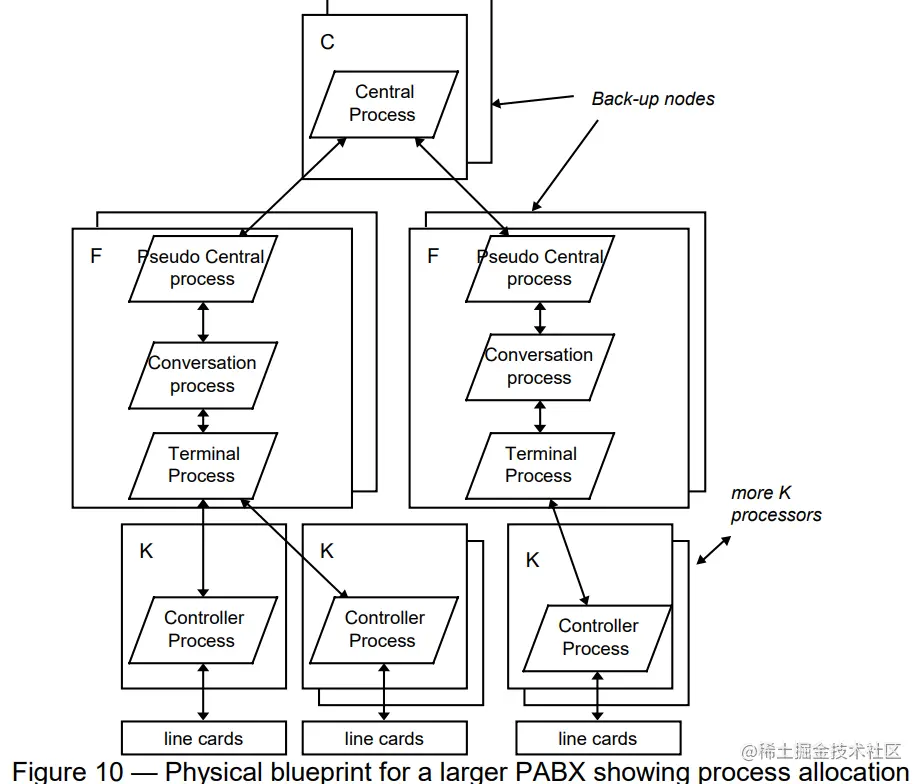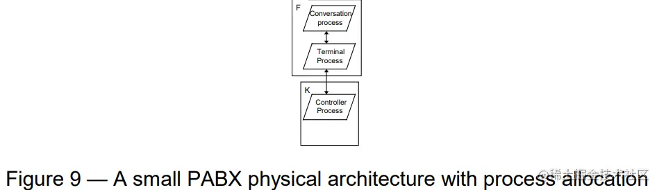 图8显示了大型PABX系统的一种的硬件配置方案,图9和图10显示了如何将过程架构映射到小型PABX系统和大型PABX系统两种不同的物理架构。C、F和K是三种拥有不同容量的计算机,支持三种不同类型的可执行文件。