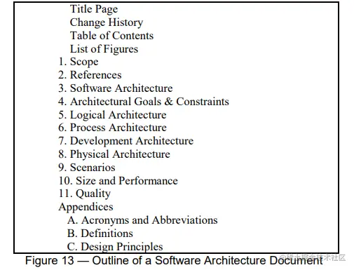 - 软件架构文档。它的结构按照“4+1”视图(参见图13中的大纲)组织。