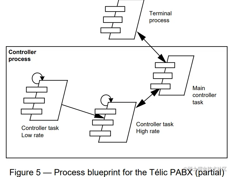 其结果是将类(以及实例对象)映射到过程架构中的任务和进程上。通常每个主动类会分配一个代理任务。有时稍有不同:一个类会分配多个代理以增加吞吐量。或者将几个类映射到一个代理上,如果这些类的操作很少被调用,或者为了保证类按顺序执行。值得注意的是,并不存在线性的、确定性的,可以直接得到最优过程架构的方法。通常需要多次迭代才能得到一个可行的方案。此外还有其他的一些方法,比如Birman或Witt展示的例子。用于构造映射的具体方法不在本文的讨论范围内,但是我们可以用一个简单的例子做一些说明。