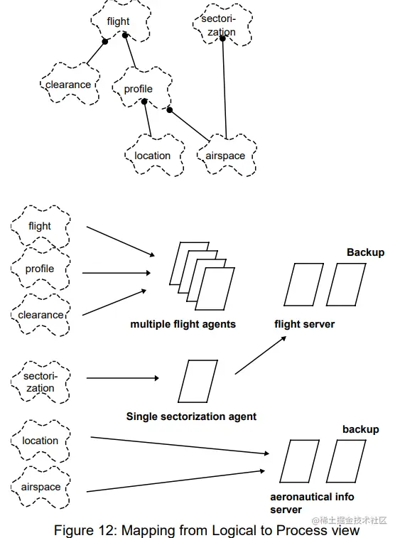 图12显示了一个假想的空中交通管制系统中,类是如何映射到进程的。