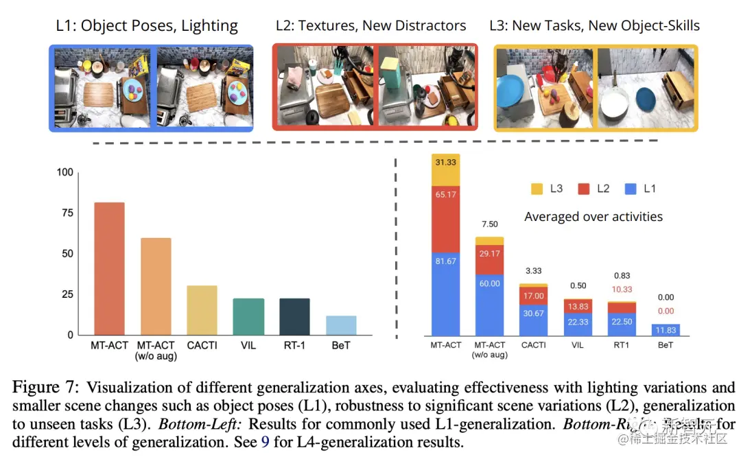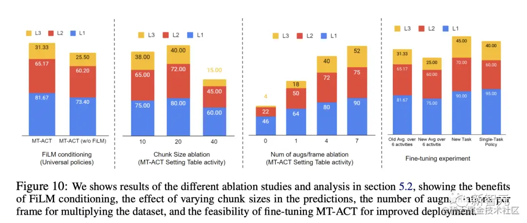 研究人员只绘制了L1泛化的结果,因为这是大多数其他模仿学习算法使用的标准设置。从图中可以看出,所有只模拟下一步行为(而不是子轨迹)的方法都表现不佳。在这些方法中,研究人员发现基于动作聚类的方法(BeT)在多任务设置中的表现要差得多。此外,由于研究采用的是低数据机制,需要大量数据的类似RT1的方法在这种情况下表现不佳。相比之下,MT-ACT策略使用动作检查对子轨迹进行建模,其表现明显优于所有基线方法。图7(右下)显示了跨多个泛化级别(L1,l2和 L3)的所有方法的结果。此外,研究人员还分别报告了每种活动的泛化结果。从图8中可以看到,每种语义增强方法都对每种活动的性能产生了积极影响。