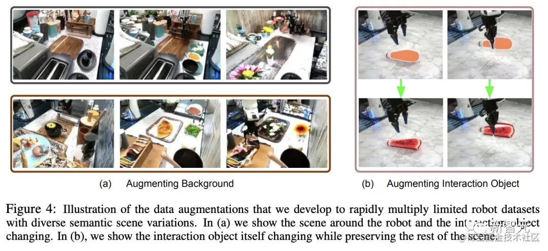 由于收集的数据集无法满足对场景和物体多样性的需求,因此研究人员通过离线添加不同变化的场景来增加数据集,同时保留每个轨迹中的操纵行为。基于最近在分割和局部重绘(inpainting)模型取得的进展,研究人员从互联网数据中提炼出真实世界的语义先验,以结构化的方式修改场景。