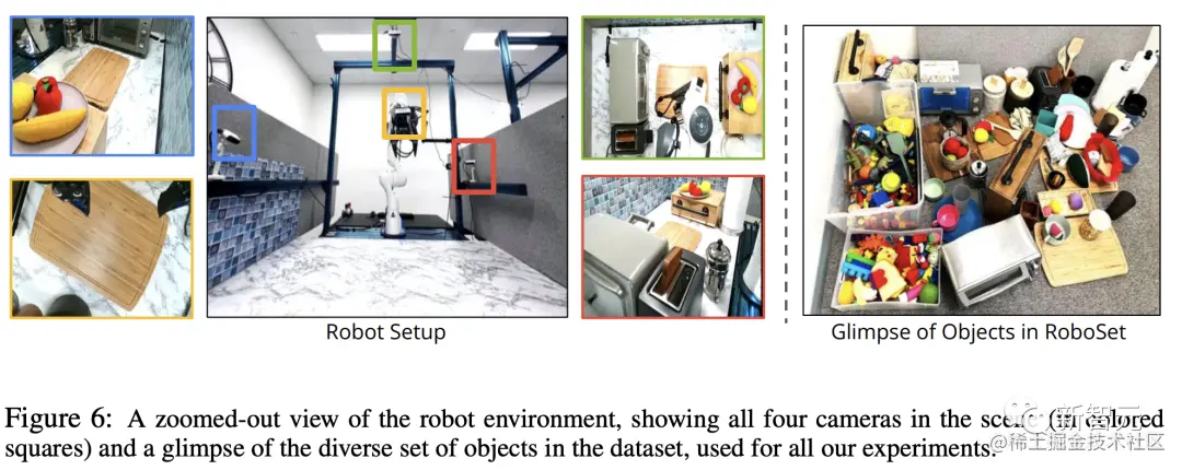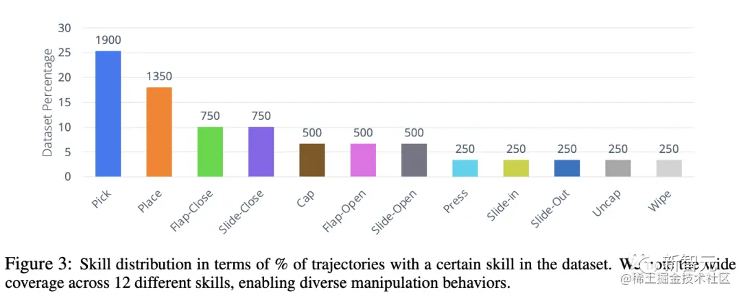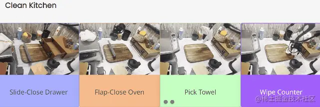 虽然常用的「拾取-放置」技能在数据集中占40% ,但也包括丰富的接触技能,如擦拭、盖帽,以及涉及铰接物体的技能(翻转-打开、翻转-关闭)。研究人员在4个不同的厨房场景实例中收集整个数据集,这些场景中包含各种日常物品。此外,团队还将每个场景实例与不同变化的物体进行交换,从而让每个技能接触到多个目标物体和场景实例。