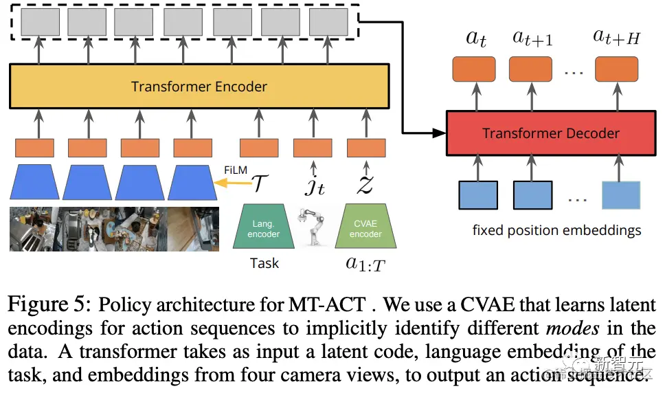 CVAE 的风格嵌入z,以及语言嵌入T作为输入。然后,再使用基于FiLM的调节方法,以确保图像token能够可靠地集中在语言指令上,从而在一个场景中可能存在多个任务时,MT-ACT策略不会对任务产生混淆。编码后的token将进入具有固定位置嵌入的Transformer策略解码器,最终输出下一个动作块(H个动作)。在执行时,研究人员会对当前时间步预测的所有重叠操作,取平均值(当H > 1时,行动块会重叠),并执行产生平均后的行动。