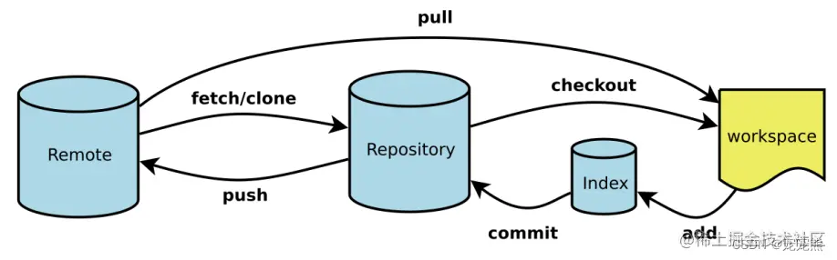 git本地有三个工作域:工作区(working directory), 暂存区(stage/index), 资源库(repository)。如果再算上远程服务器上的git仓库(remote directory)就可以分为四个工作域。其关系如下: