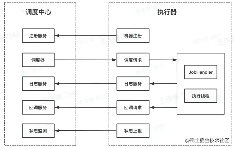- 调度器发出调度请求,执行中心进行任务执行,中间可能会回传日志文件,也可能发出回调请求