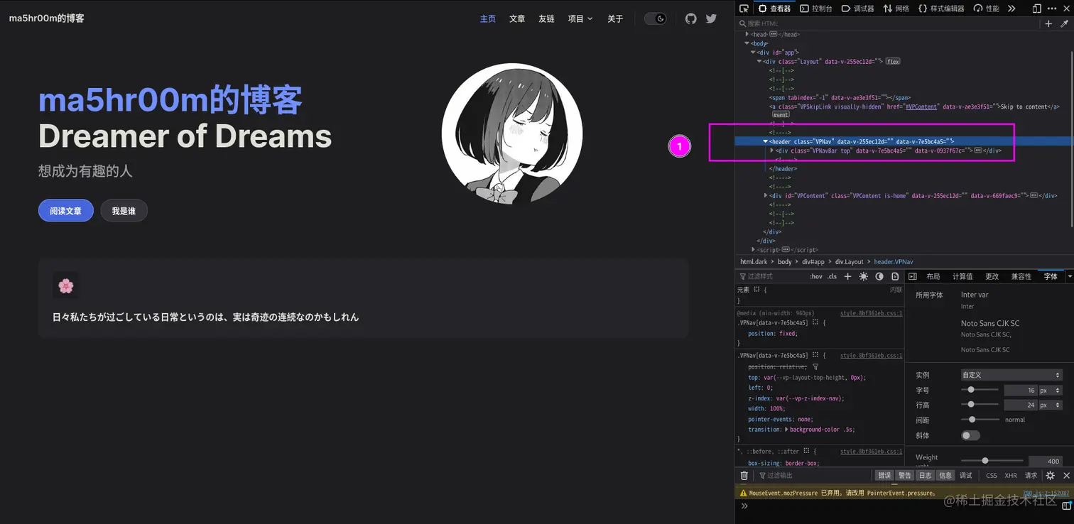 比如著名的 VitePress 框架,就使用了很多语义化标签,比如下图中展示的 <header>: