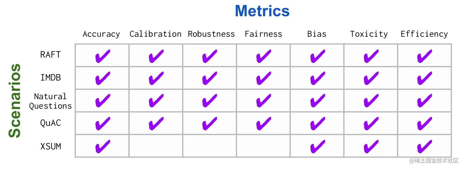 HELM(Holistic Evaluation of Luaguage Model)从名字上就能看出这是一个以全面评估语言模型的基准测试,其包含了七个评估指标,分别是精准度、校验、鲁棒性、公平、偏见、毒性和效率(原味ccuracy, calibration, robustness, fairness, bias, toxicity, and efficiency),提高模型的透明度。HELM力求一个广泛的覆盖,建立一个多评估指标的评估方法,并给出标准化的场景完成全面的评估。