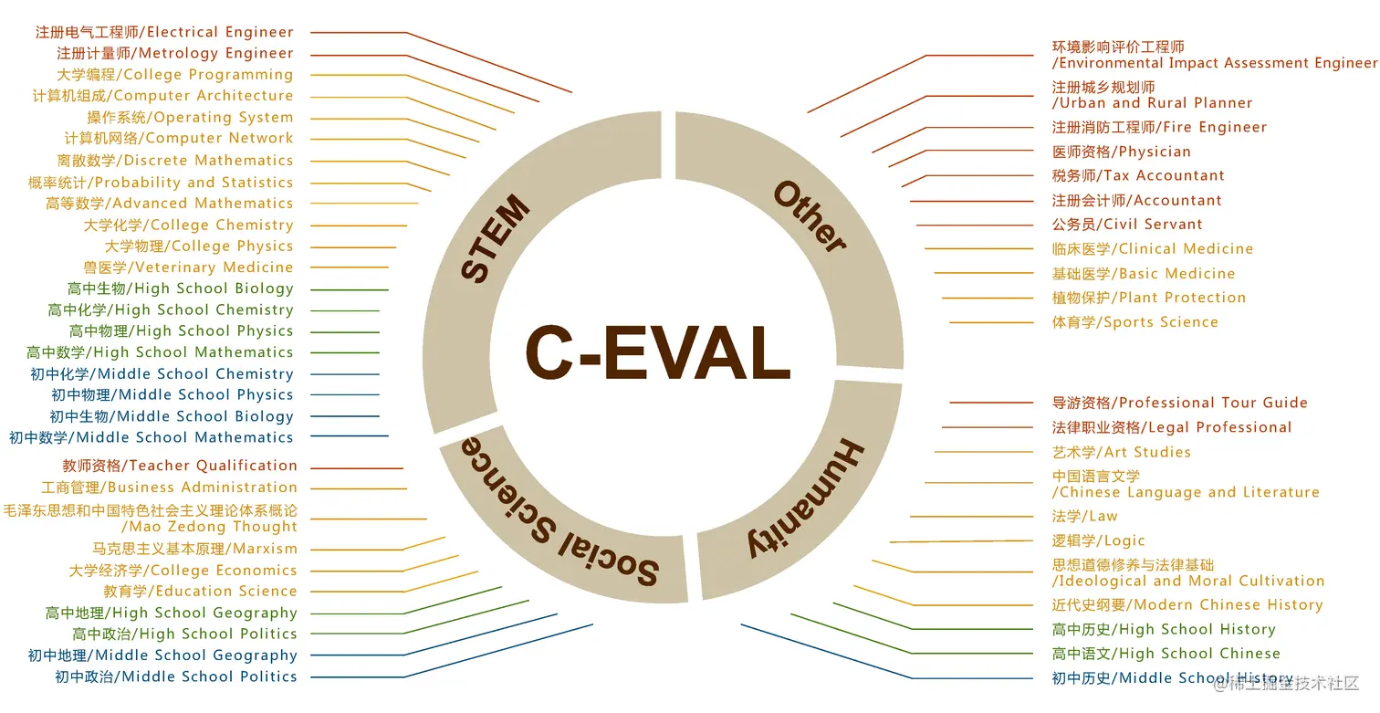 清华大学和上海交通大学联合发布了中文 MMLU:C-Eval基准测试。C-Eval包含了13948个多项选择题,涵盖了52个不同的学科和四个难度级别,如图 4 所示。