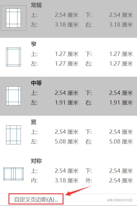 3.选择【自定义边距】,在弹出的对话框中,将顶部页边距调整为较大的数值,例如1.5英寸;