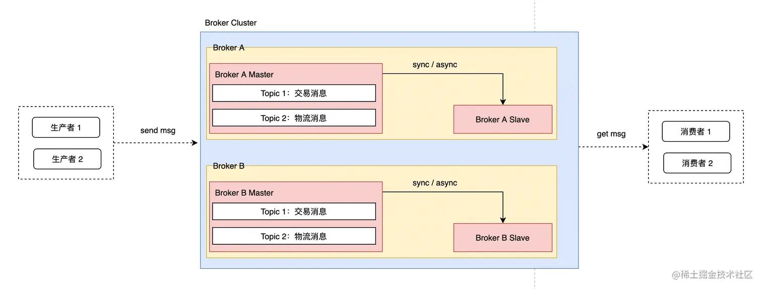 - Broker Master:可以用于消息生产,也可以用于消息消费,并将消息数据 Sync / Async 到Slave。