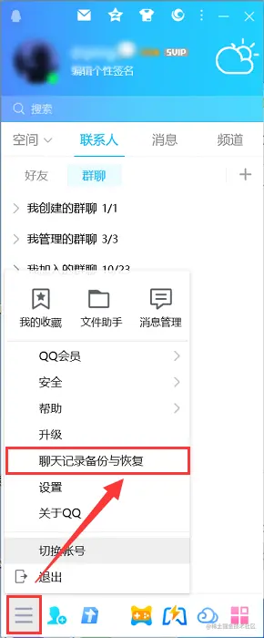 步骤1:在电脑上登录QQ,然后下拉QQ面板,点击【主菜单】点击【聊天记录备份与迁移】。