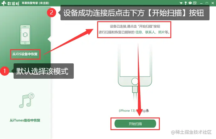 步骤2:使用数据线连接您的iPhone和计算机,软件默认【从iOS模式中恢复】,待显示连接成功后点击【开始扫描】。