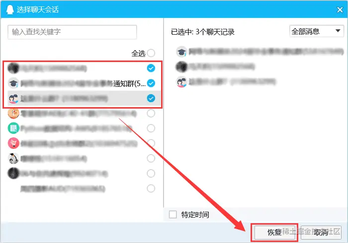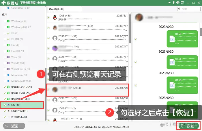 步骤3:勾选想要恢复的聊天会话,选中后点击【恢复】,然后返回手机即可查看到刚刚恢复的聊天记录。