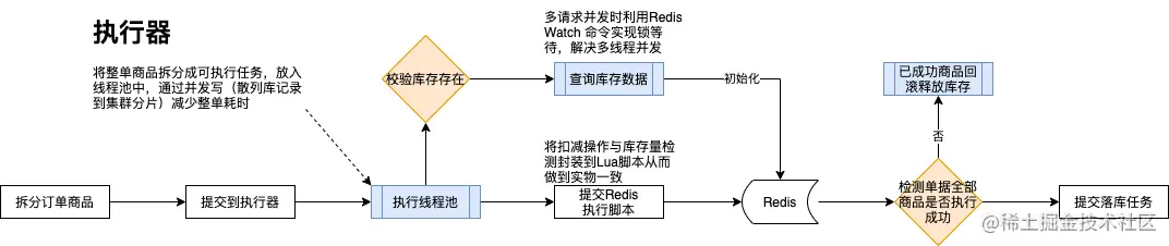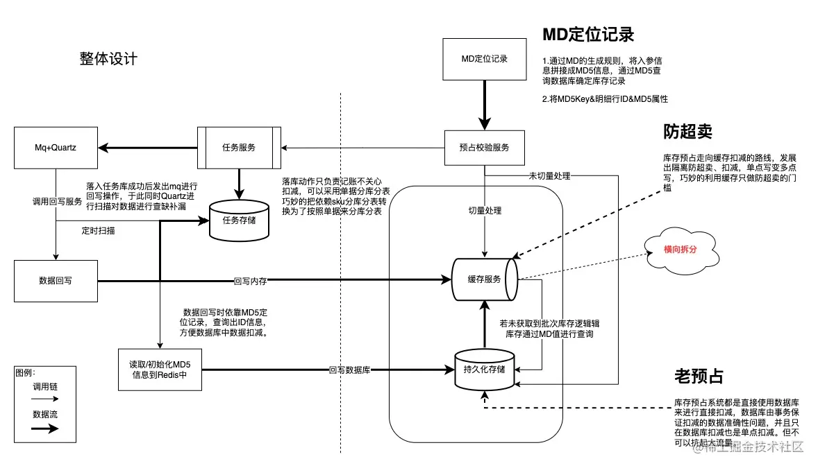 - 扛量部分:库存性能瓶颈在预占,传统架构主要依靠数据库事务保持数据一致以及数据读写;新版架构设计将数据扛量部分移植到Redis,利用Redis高性能吞吐解决高并发场景下数据读写。