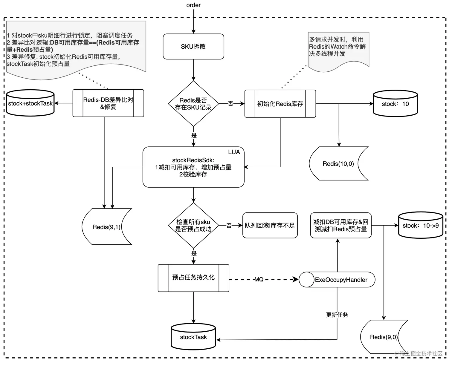 - 比对过程中,DB中sku明细行进行锁定(for update),比对逻辑为DB可用库存量==(Redis可用库存量+Redis预占量)