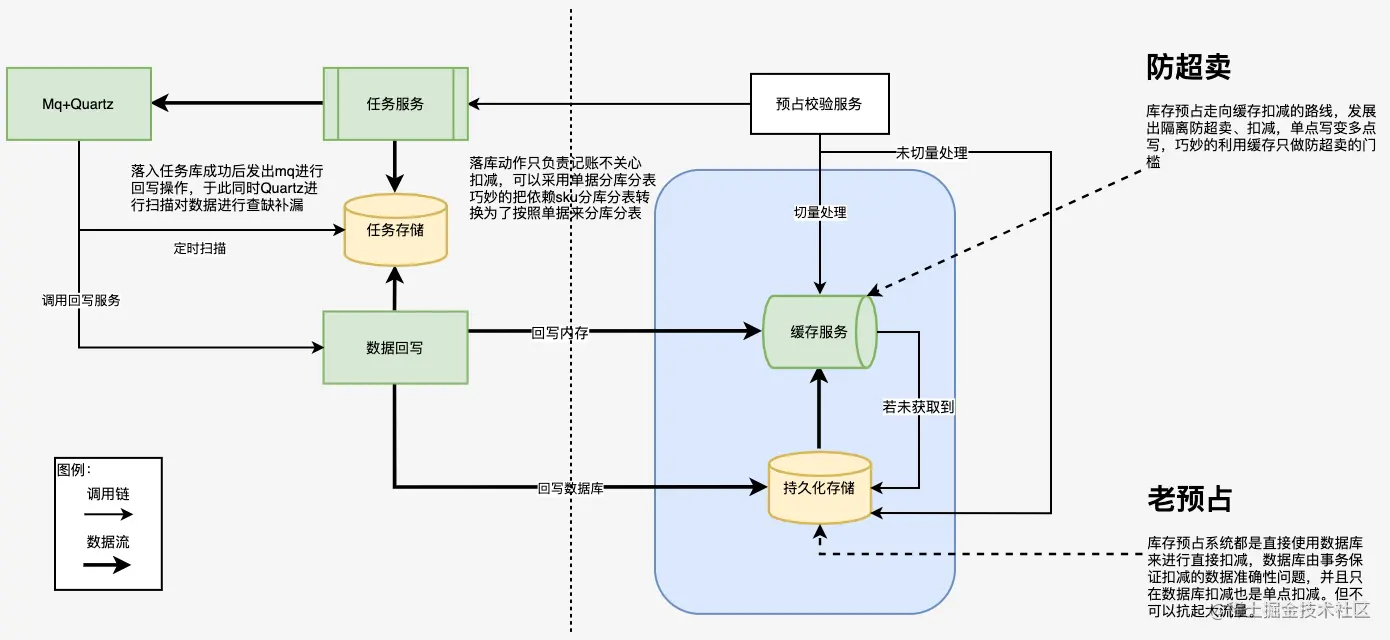 - 差异部分:老版本库存预占设计仅依靠数据进行数据处理,新版设计依靠切量配置建数据切换到Redis,利用Redis高读写进行削峰操作。