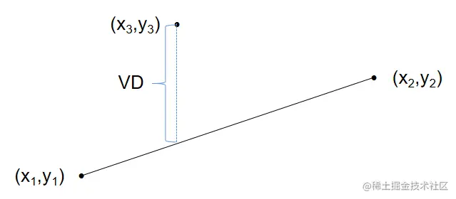 其中,上述点到直线的距离计算常用的是垂直距离(Vertical Distance),本文中的脚本实现也将采用该距离计算公式。对于点(x3,y3)到另外两点(x1,y1)、(x2,y2)所构成直线的距离的计算公式为