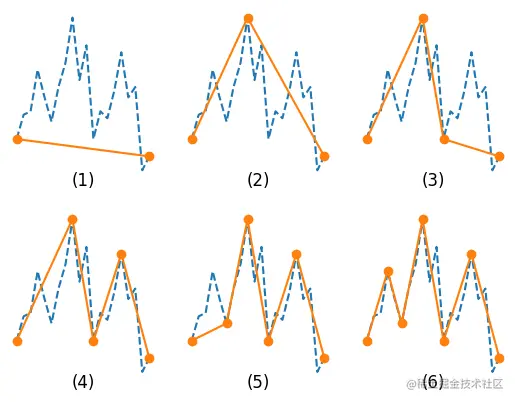 PIP(Perceptually Important Points)算法又叫要点感知算法,是一种时间序列聚合算法,其思路是:对于一个长度为 n 的时间序列数据,迭代地依据最大距离原则采样出 k 个数据点, k 是人为设置的降采样数据点数(k <= n)。PIP 算法的具体步骤如下(论文参考:sci-hub.se/10.1109/isc… )