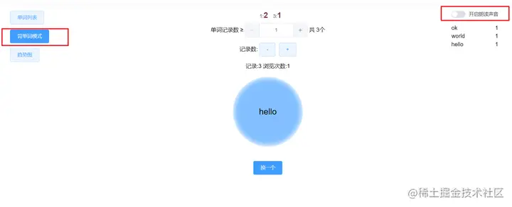 在单词记录数>=处,可以将记录数 大于某个次数的单词筛选出来,这样我们就可以背指定记录数的单词,也就是自己的高频词。右上角可以开启单词发音,我做了一个定时,切换单词2s后,会显示单词释义。