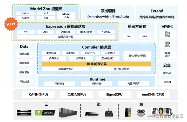 下面这个图中橙色部分HERE就是梯度累积算法在AI系统中的大致位置,一般在AI框架/AI系统的表达层,跟算法结合比较紧密。