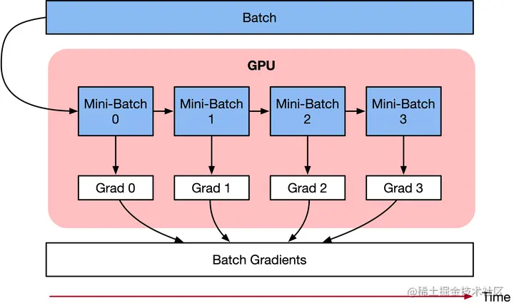 解决AI加速芯片内存限制,并运行大Batch size的一种方法是将数据Sample的Batch拆分为更小的Batch,叫做Mini-Batch。这些小Mini-Batch可以独立运行,并且在网络模型训练的时候,对梯度进行平均或者求和。主要实现有两种方式。