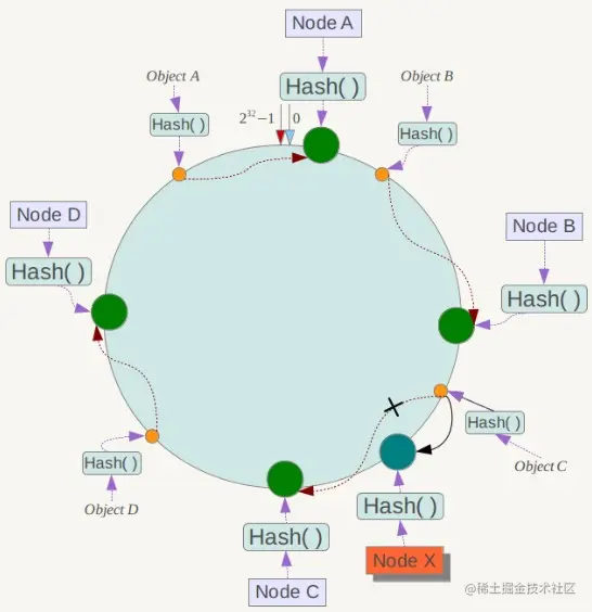 一致性哈希在增加或者删除节点时只会影响到哈希环中相邻的节点,例如下图中新增节点 X,只需要将它前一个节点 C 上的数据重新进行分布即可,对于节点 A、B、D 都没有影响。