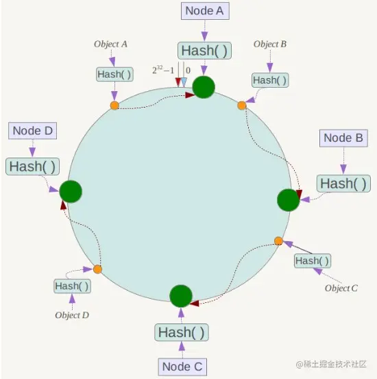 将哈希空间 [0, 2n-1] 看成一个哈希环,每个服务器节点都配置到哈希环上。每个数据对象通过哈希取模得到哈希值之后,存放到哈希环中顺时针方向第一个大于等于该哈希值的节点上。