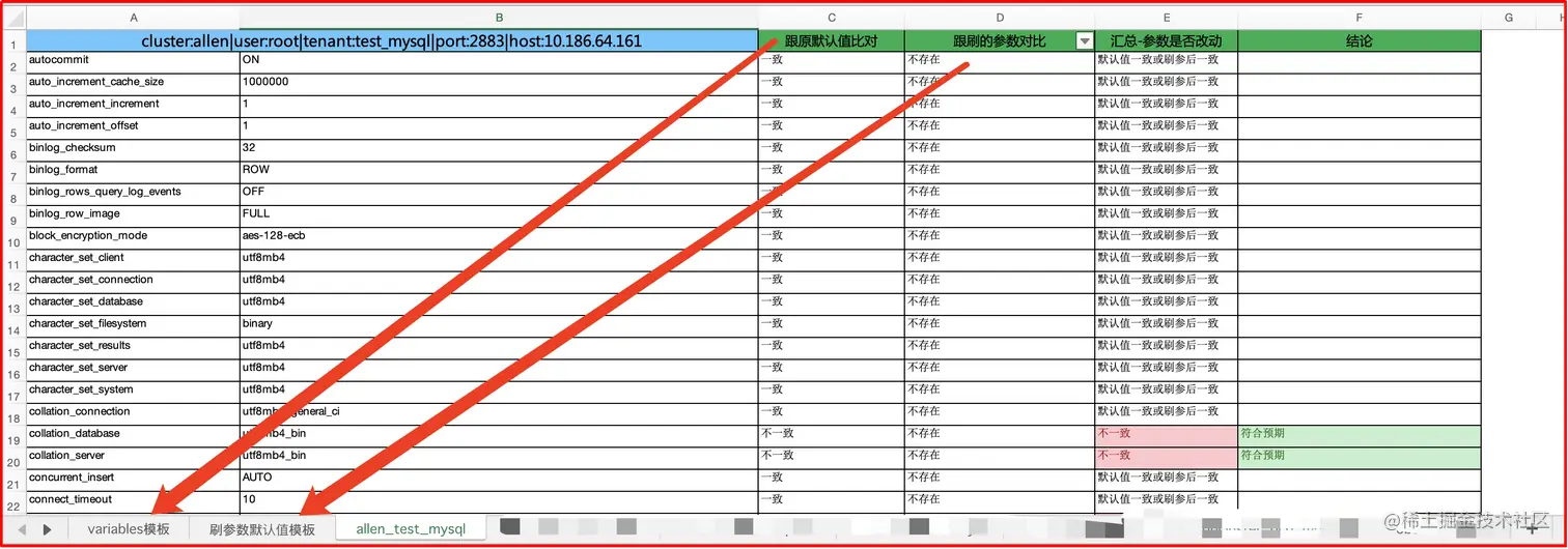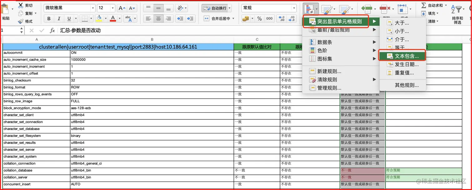 在生产环境运行 Shell 脚本获取参数,将参数放至 Excel,基于 vlookup 进行跨 sheet 对比,将不符合预期的参数值以红色底纹展示。