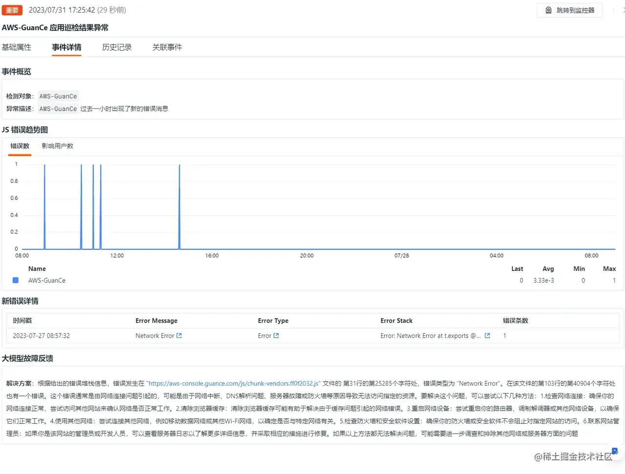错误巡检的主要目的是发现新出现的错误消息(error stack),原有的巡检在上报了相应的事件报告后,只是定位了问题,并没有给出合适的解决方案。OpenAI 的出现,给了解决个性化 error stack 的一些洞察和解决方案。