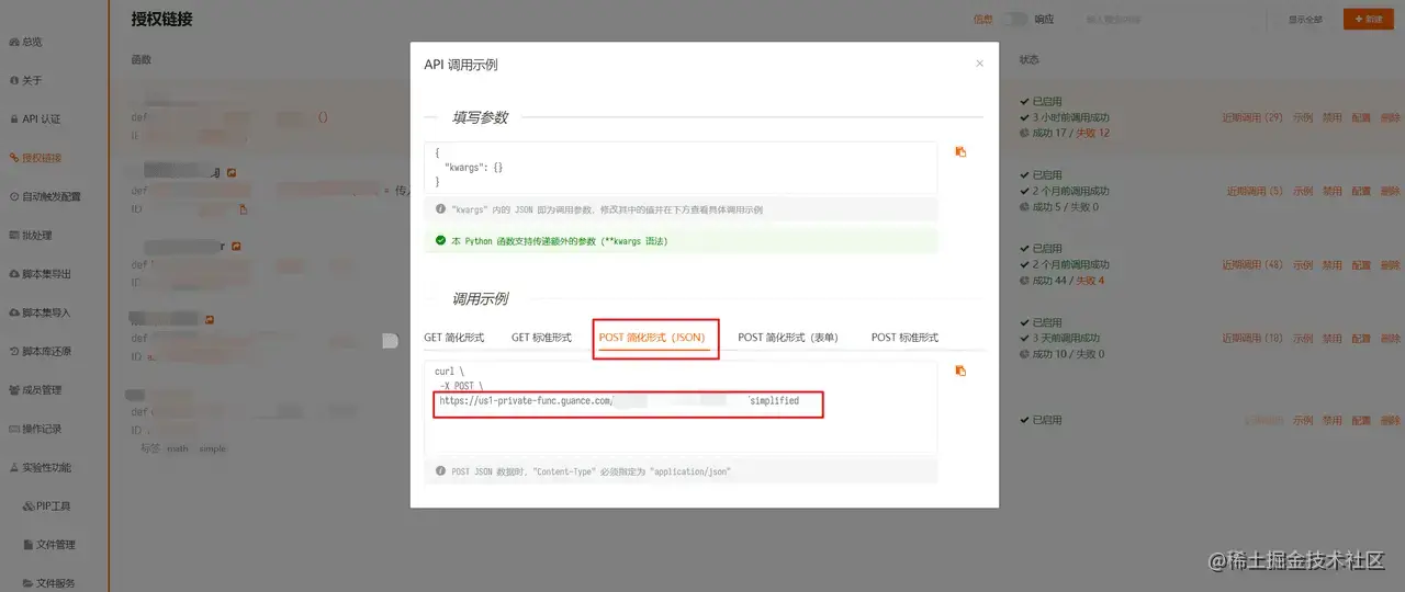 4.url 处填写第一步中授权链接的 POST 简化形式(JSON) 。