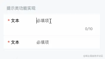 上面两个例子对输入框设置了必填项提示、清除按钮提示、字数显示和错误文案的提示,错误提示的非空校验也运用 onChange 和 onFocus 事件做了个小案例,具体效果如下: