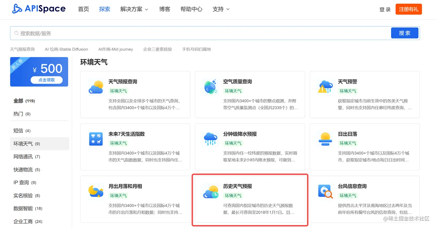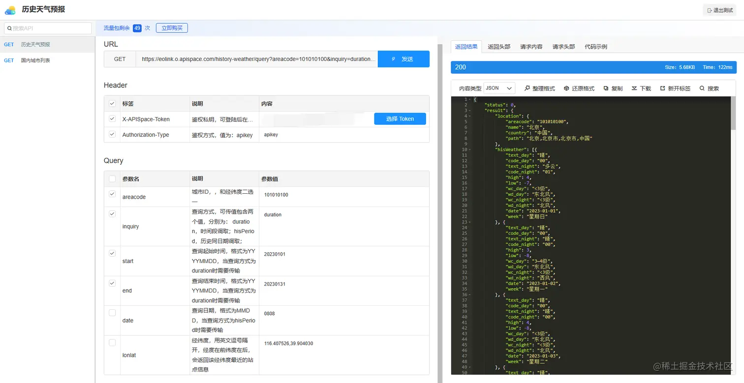 本文我将使用 APISpace 的 历史天气预报 API,来给大家演示如何将历史天气预报快速的接入到自己的应用中。除了历史天气预报 API,APISpace 上关于天气类的接口,还有 天气预报 、 天气预警 、 空气质量 、 分钟级降水预报 等API。感兴趣的同学可以上去了解一下~