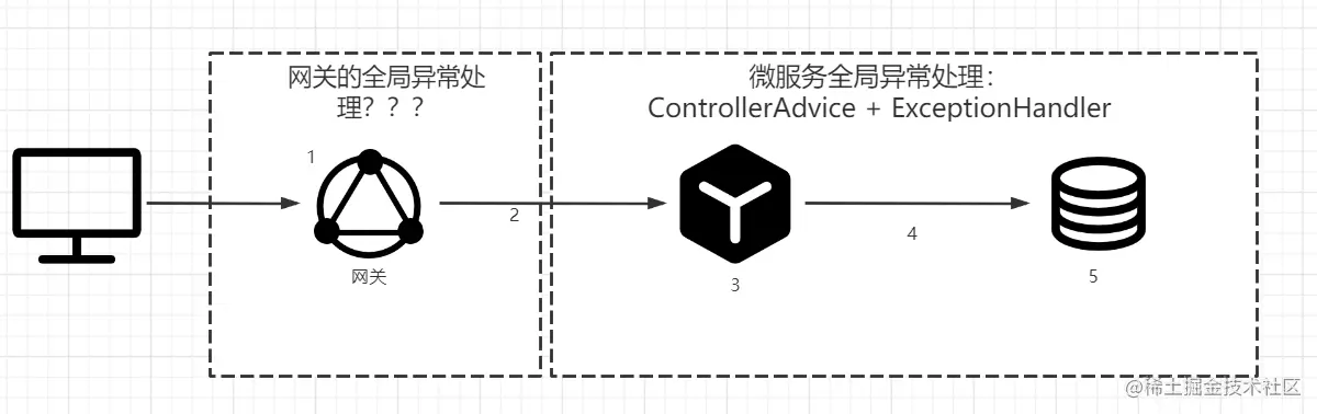 下图表示的是一次请求,经由网关转发微服务并由微服务操作数据库的一次请求处理流程。在请求处理过程中包含5处可能出现异常的位置